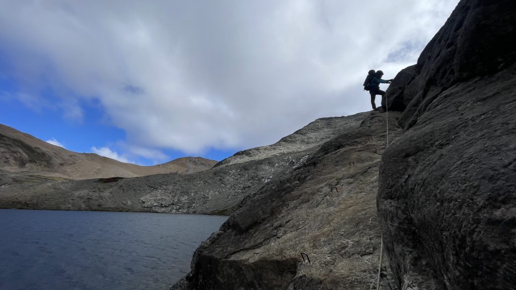 Começamos nosso roteiro com transporte privado de Bariloche até Colonia Suiza (aprox. 40 min). De lá, iniciamos a trilha pelo clássico caminho margeando o Arroyo Goye, com uma caminhada gradual por bosques patagônicos. O trecho final é uma subida desafiadora em zigue-zague (“Los Caracoles”), até o Refúgio Itália, às margens da mística Laguna Negra. Primeiro pernoite em abrigo ou acampamento.