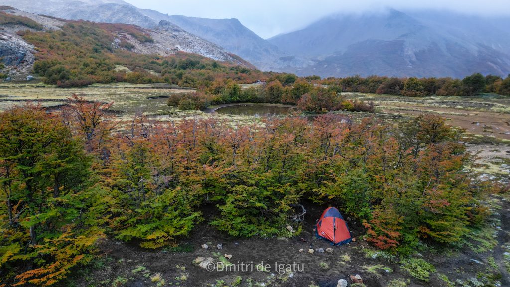 Após o café da manhã, contornamos a Laguna Negra e enfrentamos o trecho mais técnico da travessia: passagens expostas, cordas fixas e escalaminhadas leves. Um esforço recompensado com a primeira vista do imponente Cerro Tronador. Descemos até o Arroyo de La Chata, onde recarregamos as energias, e seguimos uma subida por bosques fechados até o acampamento selvagem na isolada Laguna CAB.